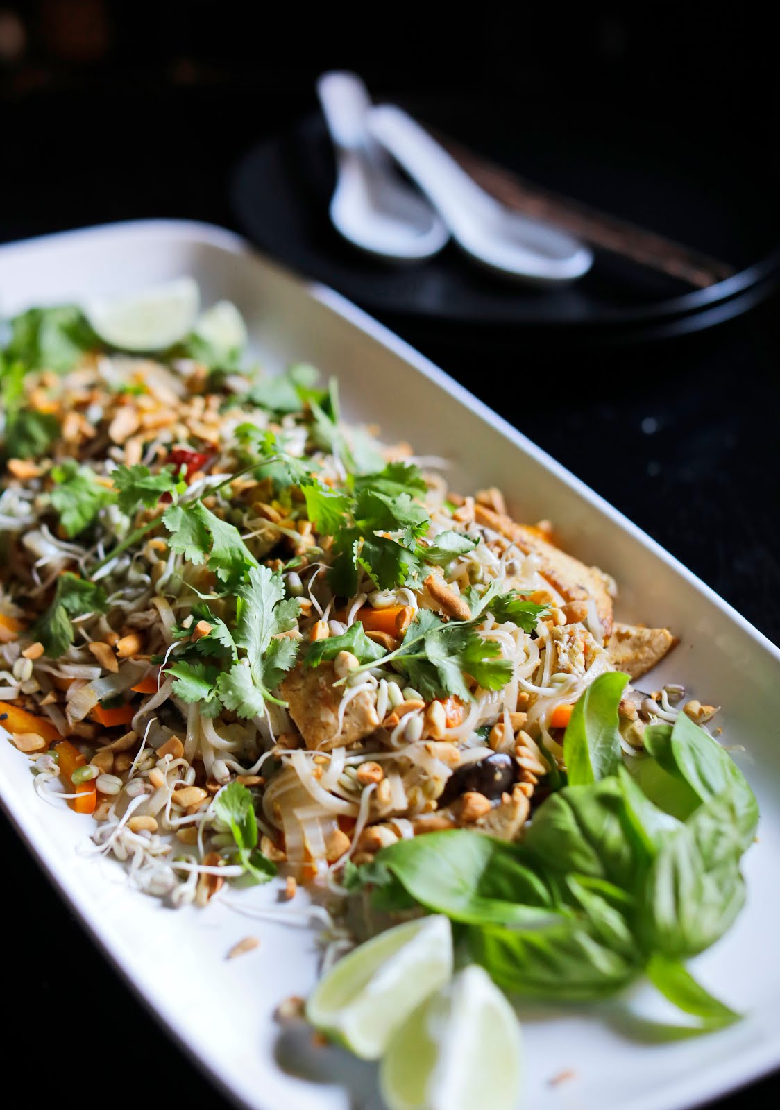 Add the mushrooms, cabbage, onions, bell peppers, and tofu. Cook, stirring frequently for 4 minutes or until the cabbage has wilted. Add the noodles and the Pad Thai Sauce. Stir and cook until everything is throughly heated through; this will take about another 2 minutes. Place Pad Thai onto a serving platter and garnish with mung bean sprouts, cilantro leaves, and chopped peanuts. Serve the lime, basil, and sambal on the side. (Makes 4 servings.)